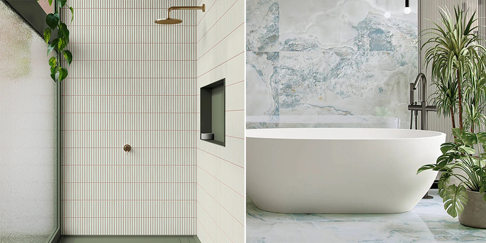 Left: Kit Kat Fern Tiles, Right: Symphony Azul Polished Onyx-effect Porcelain