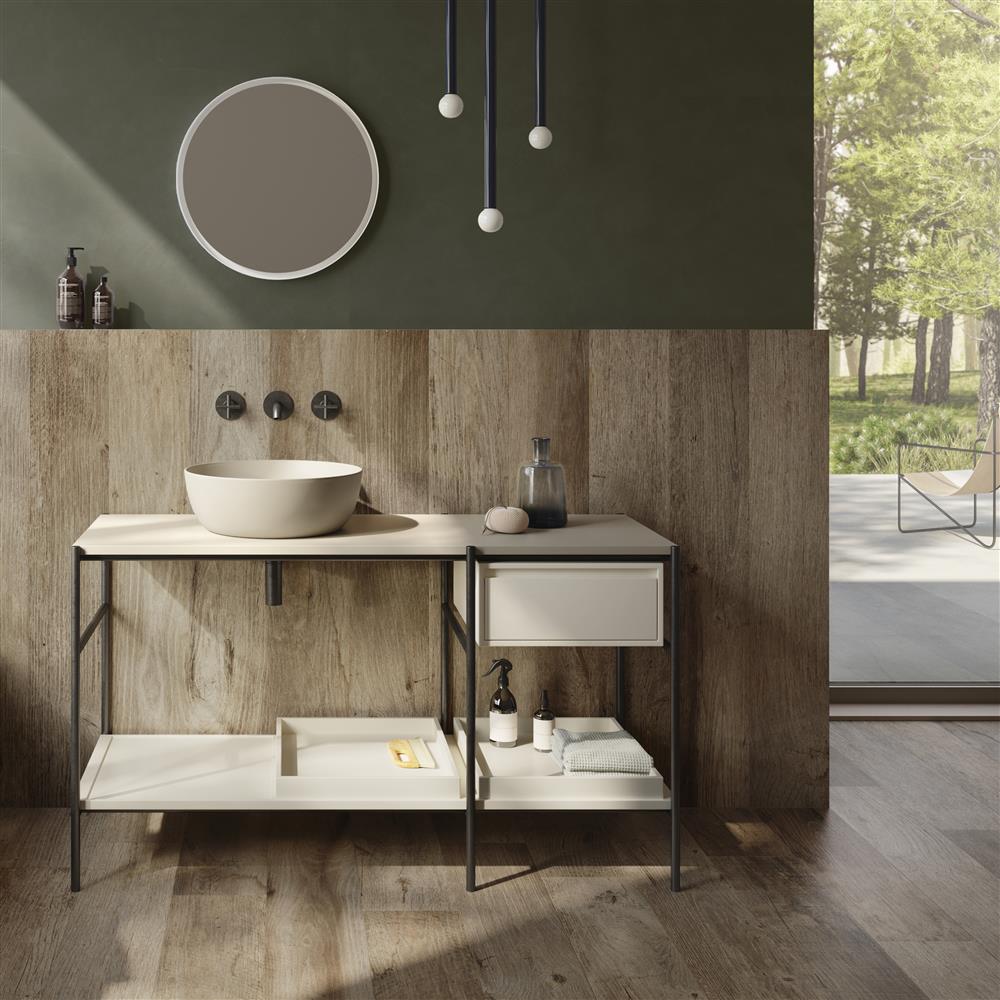 Meanwhile, you should keep bathroom features like handles and taps to creams, off-whites, or accented metals like brass or matt black powder coated steel, depending on the vibe you’d like to achieve.