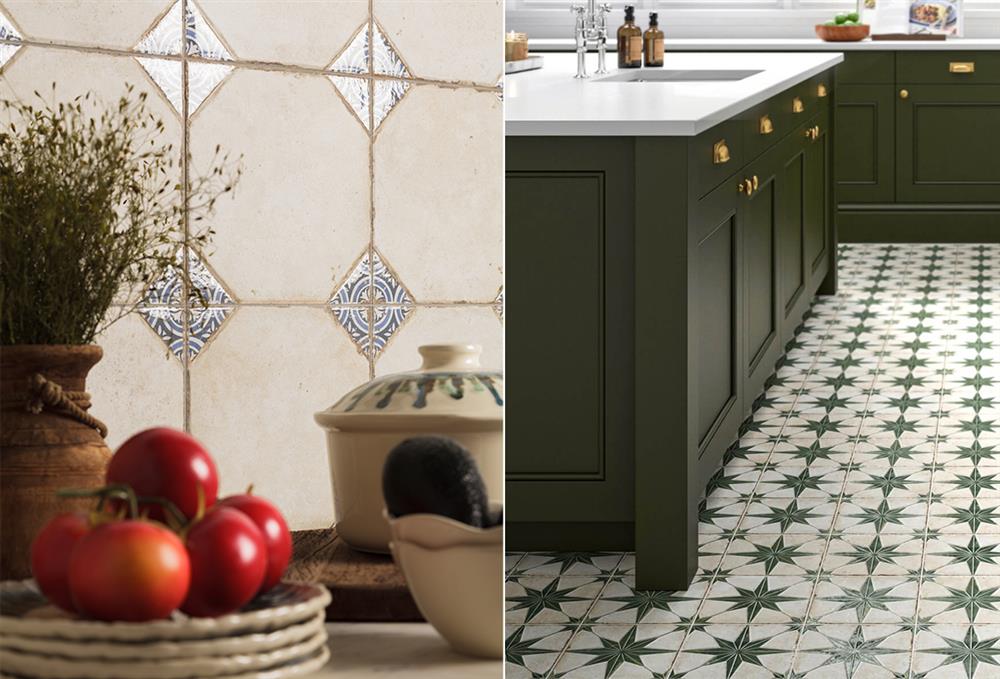 Left: Porto Vintage Blue Patterned Tiles, Right: Celestial Sage Patterned Tiles