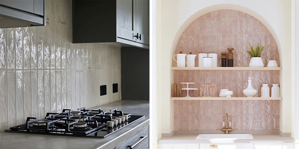 (Left) Horizontal Babylon olive metro tiles, (Right) Wentworth flower patterned wall tiles