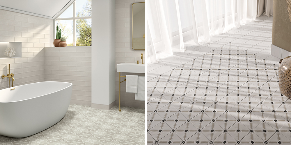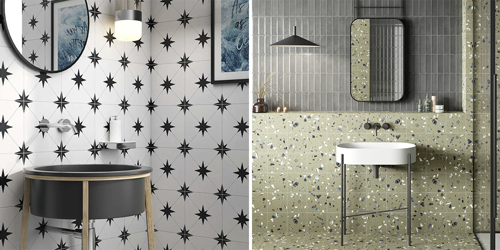 These statement patterned floor and wall tiles are perfectly balanced when complemented with simple, modern furniture, with rounded shapes and pops of colour or wood to soften. If you’re concerned about this style of tile becoming overwhelming, consider pairing them with a plain tile or even painted wall panelling to break up the patterned area.