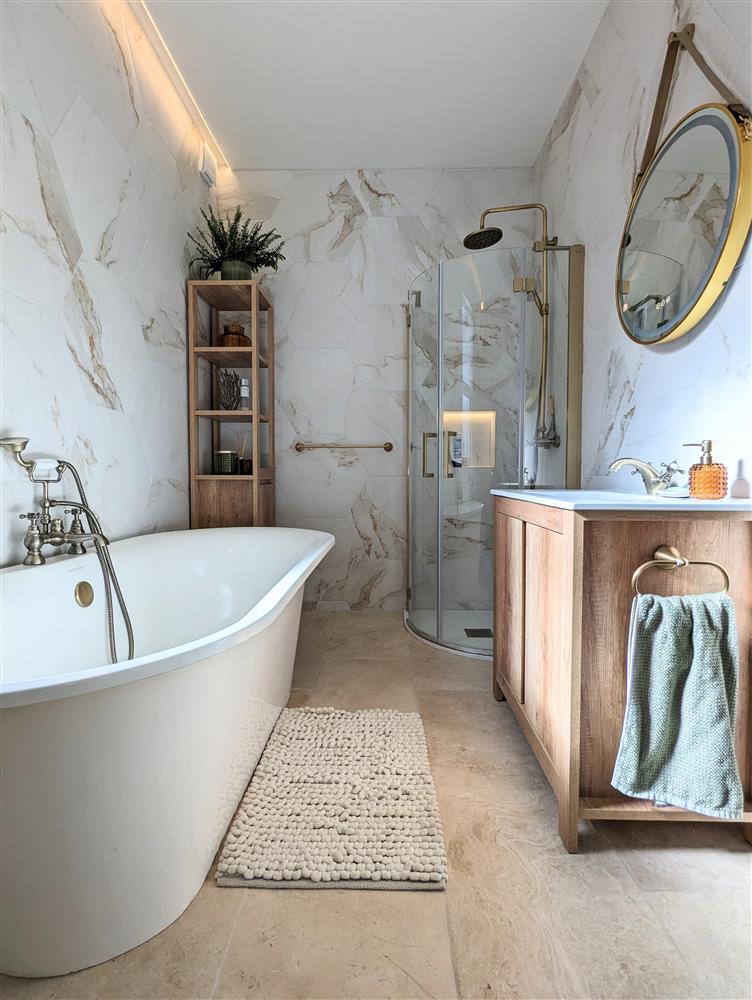 To minimise the need for external storage and to keep your bathroom looking tidy, incorporate recessed shelving or niches within tiled walls. These built-in features offer a sleek and streamlined look, ensuring that no space is wasted, to make the bathroom appear even more spacious.