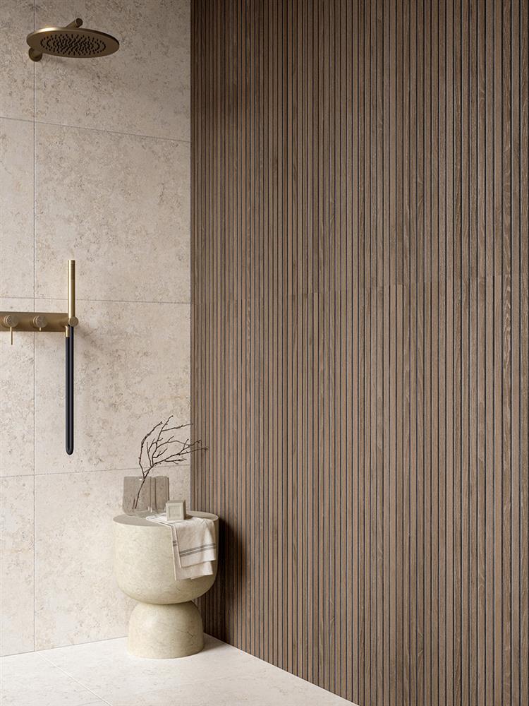 Jurassic White & Nordic Cognac Walnut Slatted Porcelain Tiles