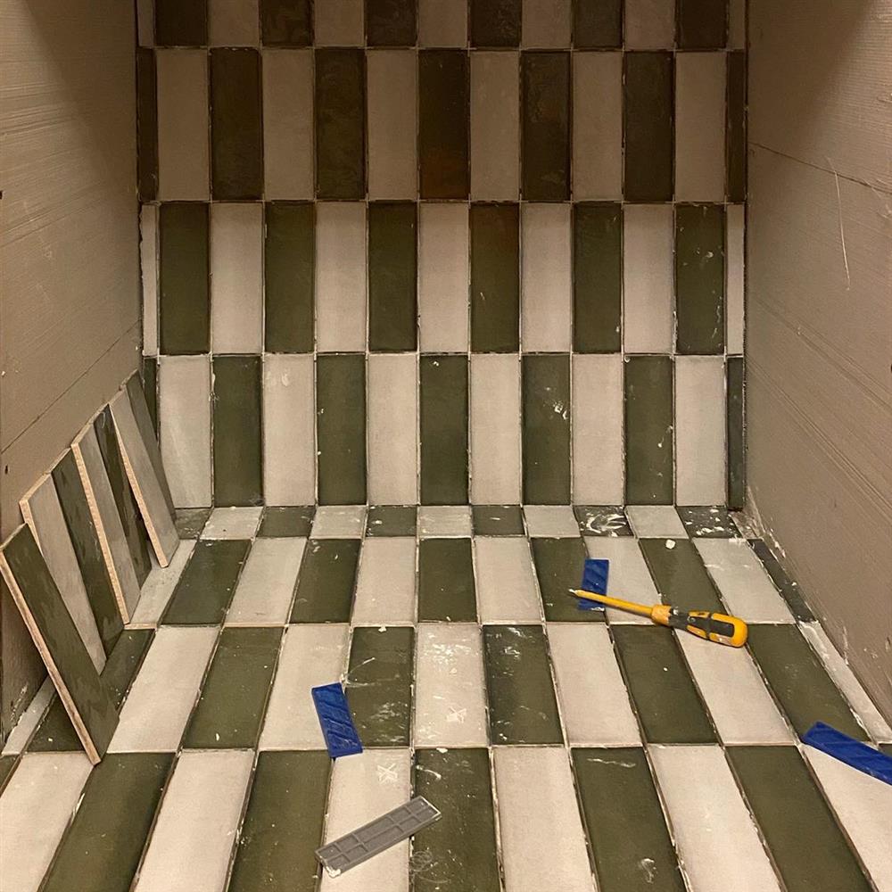 - Double-check Your Quantities: When tiling a checkerboard design, you need to only have half of your measured area for each tile colour/design. However, be sure to order at least 10% extra for cuts and wastage in each design to ensure you have enough without compromising the pattern.